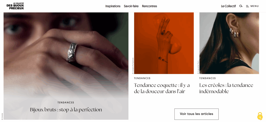 Rédactions de dizaines d’articles pour le site internet. Des articles qui traitent des tendances, des bijoux, des savoir-faire, des matières ou des métiers de la bijouterie-joaillerie. Du contenu pensé aussi bien pour apprendre que pour s’inspirer, sur des thématiques très différentes. Chaque article met en avant des bijoux des marques appartenant au Collectif Les Bijoux Précieux.